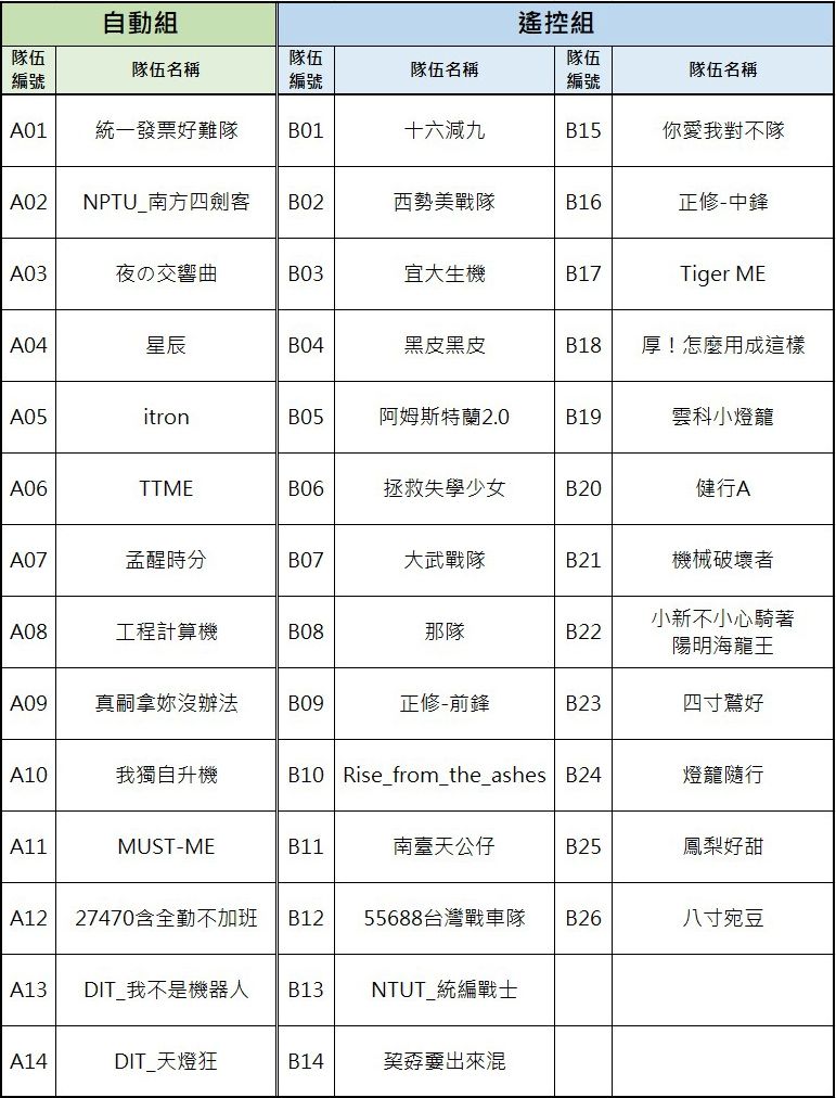 各位老師、同學們,您好:自動組與遙控組的報名成功隊伍以及隊伍編號一覽如下表,或可詳見網站「文件下載」。
